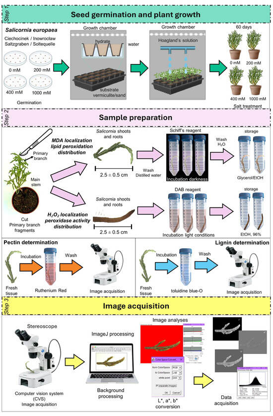 Therefore, the objectives of this study were as follows: 1. Assess oxidative stress responses in shoot and root tissues of different inland populations of S. europaea under salt stress using non-destructive, image-based detection of aldehydes produced during lipid peroxidation. 2. Examine the spatial distribution of pectin and lignin under salinity through histochemical staining combined with image analysis to elucidate the role of cell-wall modifications in salt tolerance. 3. Evaluate the potential of image analysis as a cost-effective tool to identify population-specific responses, distinguish salt-tolerant from salt-sensitive phenotypes, and capture spatial variation in salt accumulation within plant tissues.