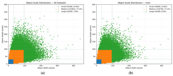 Object scale distribution of wheat spikes in the HWHD dataset, categorized by COCO size thresholds. (a) Distribution for all datasets. (b) Distribution for the training set. (c) Distribution for the validation set. (d) Distribution for the test set.