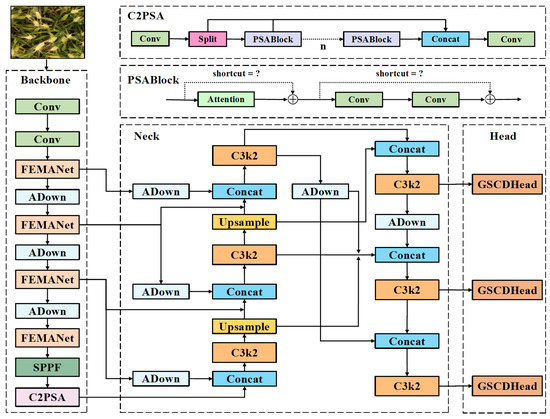 In this study, YOLOv11n is selected as the baseline model because of its minimal parameter size and computational cost. These features make it well-suited for deployment on mobile devices and edge applications. Based on this foundation, we propose FEWheat-YOLO, a lightweight and performance-enhanced model tailored for wheat spike detection. The overall architecture of the proposed model is illustrated in Figure 4. Aimed at addressing the challenges posed by dense object distribution, small object scale, and morphological diversity in wheat spike detection, FEWheat-YOLO integrates four key improvement modules. First, a mixed aggregation, multi-scale adaptive feature-enhancement module (FEMANet) is introduced to improve the backbone’s semantic understanding of small- and medium-sized objects, enabling scale-aware feature representation. Second, a lightweight bidirectional feature aggregation structure (BiAFA-FPN) is designed to reconstruct the topological connections in the FPN, thereby enhancing the efficiency and complementarity of feature fusion between deep and shallow layers. Third, a content-aware adaptive downsampling operator (ADown) is employed to dynamically preserve important structural features of wheat spikes while reducing computational complexity. Fourth, a Grouped Shared Convolution Detection Head(GSCDHead) is developed to significantly reduce model size and inference overhead through parameter sharing and task decoupling mechanisms, without compromising detection accuracy. Together, these modules form the core architecture of FEWheat-YOLO, enabling efficient and accurate detection of multi-scale wheat spike targets while maintaining lightweight characteristics and deployment-friendliness.