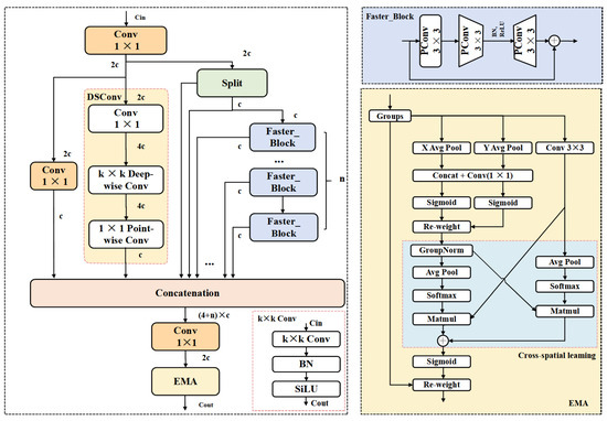 - To enhance feature extraction capability, this paper proposes FEMANet (Faster-Enhanced Mixed Aggregation Network with Efficient Multi-scale Attention (EMA)), based on the Mixed Aggregation Network (MANet) [45]. This module is designed to strengthen feature representation while minimizing the number of parameters and overall model size, facilitating efficient deployment on resource-constrained devices.