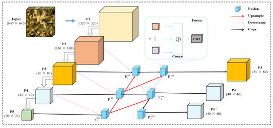 In the bottom-up path, the fusion sources include shallow high-resolution features, shallow low-resolution features, same-level features, and features from the previous fusion stage. As a result, the P4 layer integrates semantic information from four different levels, while the P3 layer aggregates features from two levels.