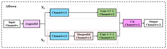 To address this issue, we introduce a compact and responsive adaptive downsampling module (ADown) [55], which is designed to preserve critical regional features during the downsampling process and enhance the model’s perceptual ability for wheat spike targets. As illustrated in Figure 7 ADown, the ADown module consists of two parallel branches, which fuse different types of spatial information to improve the overall representational capacity.