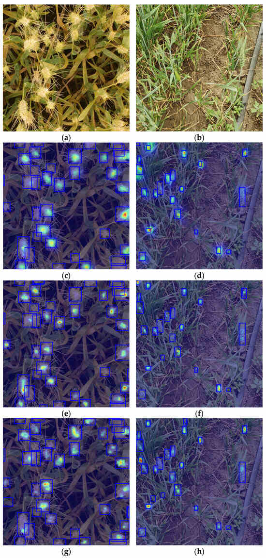 Semantic segmentation methods rely on pixel-level annotations for training and prediction, enabling effective separation between crops and background, which makes them suitable for counting tasks [21,22,23,24]. However, such methods demand high annotation precision, require significant labor and time for data labeling, and typically place a higher burden on computational resources. Density map regression methods build a direct mapping between image features and target quantities and perform well in scenarios involving dense targets and heavy occlusion [25]. Nonetheless, these methods are sensitive to annotation quality and scene consistency, and they struggle with variations in target scale. Object detection methods generate candidate regions, classify and count objects, and are capable of detecting multiple targets in complex environments with high real-time performance. As a result, object detection has become one of the mainstream approaches in current wheat spike detection research [13].