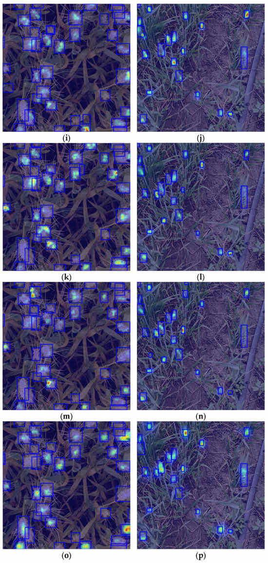 In wheat spike detection tasks, traditional methods can generally be divided into two categories: manual inspection and classical image processing techniques. Manual methods are highly subjective and susceptible to human error, often resulting in misdetection and omission [12]. Furthermore, they are labor-intensive and not suitable for large-scale agricultural production [13]. As an alternative, traditional image processing techniques have been widely applied in early studies on spike detection and counting. For instance, JA Fernández Gallego et al. developed an automatic spike counting approach under natural lighting conditions using top-view RGB imagery [14]. Specifically, RGB images of wheat and barley canopies were captured in the field using a standard camera mounted on a tripod. The spike regions were then identified and counted through a combination of color segmentation, morphological operations, and contour analysis. While this method achieved promising counting accuracy under controlled conditions, it remains highly sensitive to factors such as camera angle, lighting variability, and background noise. Consequently, its generalization ability is limited in complex field environments with occlusion, weed interference, or morphological variation across cultivars, which constrains its applicability in large-scale real-world scenarios.