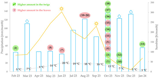 Optimum harvesting periods for the previously isolated Pachysandra alkaloids for the plants from the Botanical Garden (Münster) throughout the year (February 2023 to January 2024), as well as the weather data for each month provided by the German Weather Service “Deutscher Wetterdienst”, station Münster/Osnabrück (ID1766) [14]. Numerals in parentheses are compound numbers as used in the text and in Table 1.