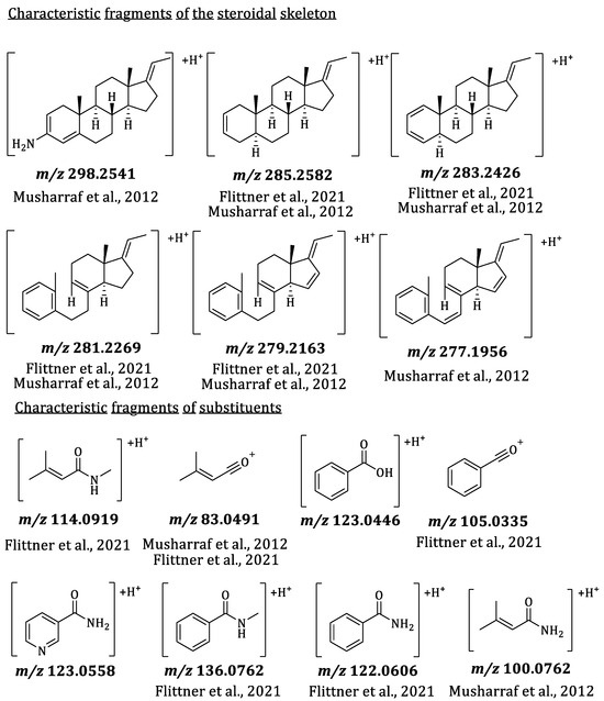 Characteristic MS/MS fragments of the steroidal skeleton and from substituents of aminosteroids from Sarcococca and Pachysandra. Most fragments were already described by Musharraf et al., 2012 [15] and Flittner et al., 2021 [8] before.