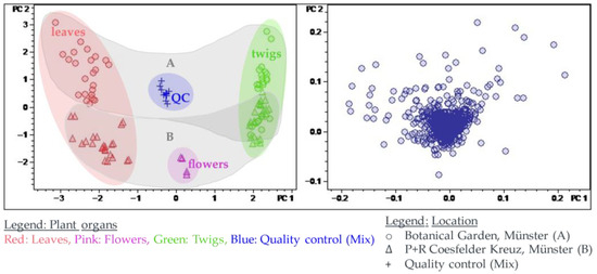 Samples were taken in monthly intervals (February 2023–January 2024) from the different plant organs (leaves; twigs; flowers if present) of two separate plant populations of P. terminalis originating from nearby locations, termed A and B (exact location see Materials and Methods and Supplementary Materials Figure S1), about 700 m apart from each other within the same city (Münster, Germany). The plant material was air-dried and extracted with 75% ethanol. A total of 50 sample extracts were analyzed by UHPLC/+ESI-QqTOF-MS/MS (henceforth abbreviated “LC/MS”). The resulting LC/MS data were converted to a matrix of variables encoding the intensity of particular MS signals in particular m/z intervals within certain retention time (tR) intervals over the chromatographic runs (<tR:m/z variables>; also termed “buckets”). The obtained data matrix consisted of 1286 variables for 130 samples. Multivariate data analysis, such as bucket statistic plots, principal component analysis (PCA), and volcano plot analysis of t-test results, was applied to extract relevant information of various kinds from the complex matrix (“bucket table”) of chemical data.