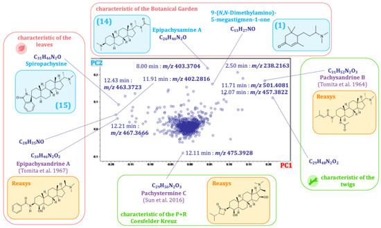 The scores plot of principal component 2 (PC2) against PC1 is dominated by differences between the plant organs and the two different populations. PC1 represents the differences between the plant organs and accounts for the largest fraction (45%) of the explained variance of the data set. PC2 explains a further 16% of the variance, caused by differences between the two distinct populations. The scores plot of PC2 vs. PC1 thus already describes 61% of the total variance. The corresponding loadings plot of PC2 vs. PC1 (see Figure 5) allowed the identification of major characteristic compounds of the plant organs and different populations/locations. In correlation with the scores plot, buckets that are characteristic of the leaves appear on the left side of the loadings plot, and buckets that are characteristic of the twigs appear on the right side. Consistently, buckets occurring near the bottom are characteristic of the plants from location B, and those at the top are characteristic of plants from location A. For a closer characterization of the buckets, the molecular formula was obtained from the accurate mass (usually representing the [M + H]+ ion, in case of compounds with two basic amino groups, also the doubly charged [M + 2H]2+ ion) and compared with the previously isolated Pachysandra alkaloids. Spiropachysine (15) (12.43 min:m/z 463.3723) was, thus, identified as a characteristic compound of the leaves of P. terminalis and epipachysamine A (14) (8.00 min:m/z 403.3704) as well as 9-(N,N-Dimethylamino)-5-megastigmen-1-one (1) (2.50 min:m/z 238.2163) as compounds characteristic of the plants from location A. The molecular formulas of unidentified buckets were compared with compounds previously isolated by other authors from Pachysandra species [17]. For the identification of the buckets, the fragment spectra were analyzed (see Figure 6 and Table S1, Supplementary Materials) and compared with the characteristic fragments described in 2.3 (see Figure 3). Epipachysandrine A [18] (12.21 min:m/z 467.3666) could be identified as another compound characteristic of the leaves, and pachysandrine B [2] (11.71 min:m/z 501.4081) as a characteristic compound of the twigs of P. terminalis. Pachystermine C [19] (12.11 min:m/z 475.3928) turned out to be characteristic of the plants of location B.