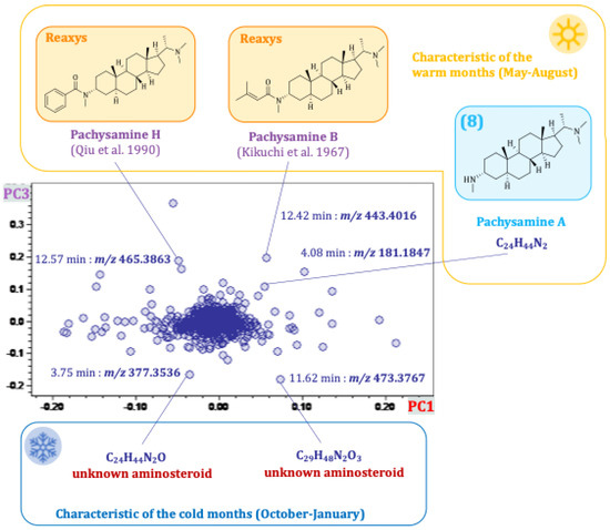 The seasonal differences between the various samples could be visualized by plotting PC3 against PC1 (see Figure 7). PC3 accounts for 7% of the variance of the total data set. The location of the data points along PC3 shows an obvious dependence on the months of sampling. The samples were grouped into warm and cold months based on the average temperature of each month, as determined by the “Deutscher Wetterdienst” [14]. Months with an average temperature < 14 °C were characterized as “cold months” (October to April), and months with an average temperature ≥ 14 °C (May to September) were characterized as “warm months”. The corresponding loadings plot revealed characteristic compounds of the cold and warm months, as shown in Figure 8. Buckets that are located at the top of the loading plot are characteristic of the warm months (except for August and September), and buckets at the bottom are characteristic of the cold months (especially October to January). The previously isolated pachysamine A (8) (4.08 min:m/z 181.1847), pachysamine H [20] (12.57 min:m/z 465.3863), and pachysamine B [21] (12.42 min:m/z 443.4016) were characteristic of the warm months. Two unknown aminosteroids with the molecular formula C24H44N2O and C29H48N2O3 appear to be characteristic of the cold months. These compounds would be interesting targets for further isolation studies, as they are probably unknown natural compounds.