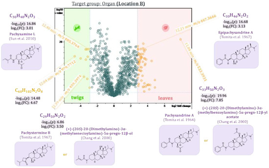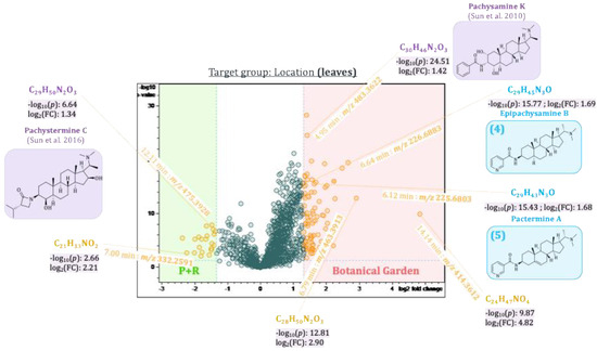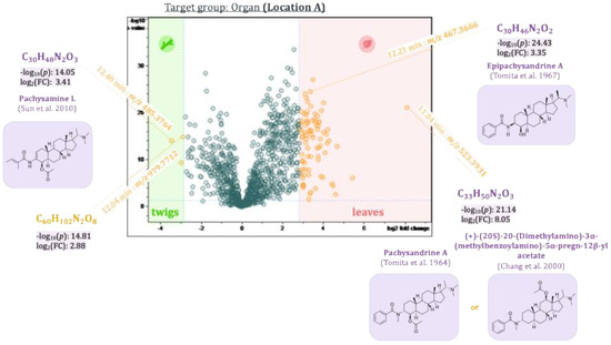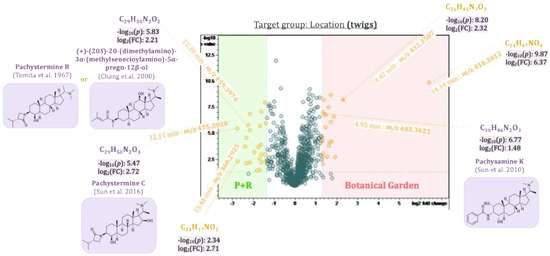 To determine differences between plant populations from two different locations, separate t-tests were calculated for their respective leaves and twigs. The results were visualized in two volcano plots (see Figure 11 and Figure 12, respectively). Pachystermine C [19] (12.11 min:m/z 475.3928), which already showed up in the loadings plot of PC2 vs. PC1, also appeared in the volcano plot of the leaves and the twigs as a characteristic compound of plants from location B. Another aminosteroid (7.00 min:m/z 332.2591), which could not be clearly identified, is also characteristic of the leaves and twigs of the plants from location B. Two other aminosteroids were mainly found in the twigs of P. terminalis plants from location B. One of these buckets (12.39 min:m/z 459.3974) could be identified as a Pachysandra alkaloid. The Reaxys database search gave two possible hits: (+)-(20S)-20-(dimethylamino)-3α-(methylsenecioylamino)-5α-pregn-12β-ol, which was isolated by Chang et al. from Pachysandra procumbens [23], and pachystermine B, which was isolated by Tomita et al. from P. terminalis [18]. The bucket (4.95 min:m/z 483.3622) was identified as a characteristic compound of the leaves and twigs of plants from location A. The accurate mass, molecular formula, and the characteristic fragments in the MS2 spectrum were consistent with those of the previously isolated 2β,3β,4β-Diapachysamine K (18) [9], but the retention time was slightly different (tR(18) = 5.37 min). The bucket, therefore, probably represents a constitutional or stereoisomer of 2β,3β,4β-Diapachysamine K, which we tentatively assigned to represent Pachysamin K [24], previously isolated by Sun et al. from Pachysandra axillaris. Furthermore, two Pachysandra alkaloids previously isolated by us, epipachysamine B (4) and pactermine A (5), were identified as characteristic compounds of the leaves from location A (from which they were indeed isolated in the previous work) [9]. Another not further identified aminosteroid (6.79 min:m/z 463.3913) was also characteristic of the leaves obtained from this location. The twigs of the plants from location A differ in a bucket (4.42 min:m/z 432.3587) that was attributed to an (unidentified) aminosteroid due to the characteristic core fragment at m/z 285. An especially high log2(fold-change) of 4.8 in the leaves and 6.4 in the twigs highlighted the bucket (14.14 min:m/z 414.3612). As the corresponding fragment spectrum showed no characteristic core fragment for aminosteroids (see also Figure 3), it could not be further characterized.