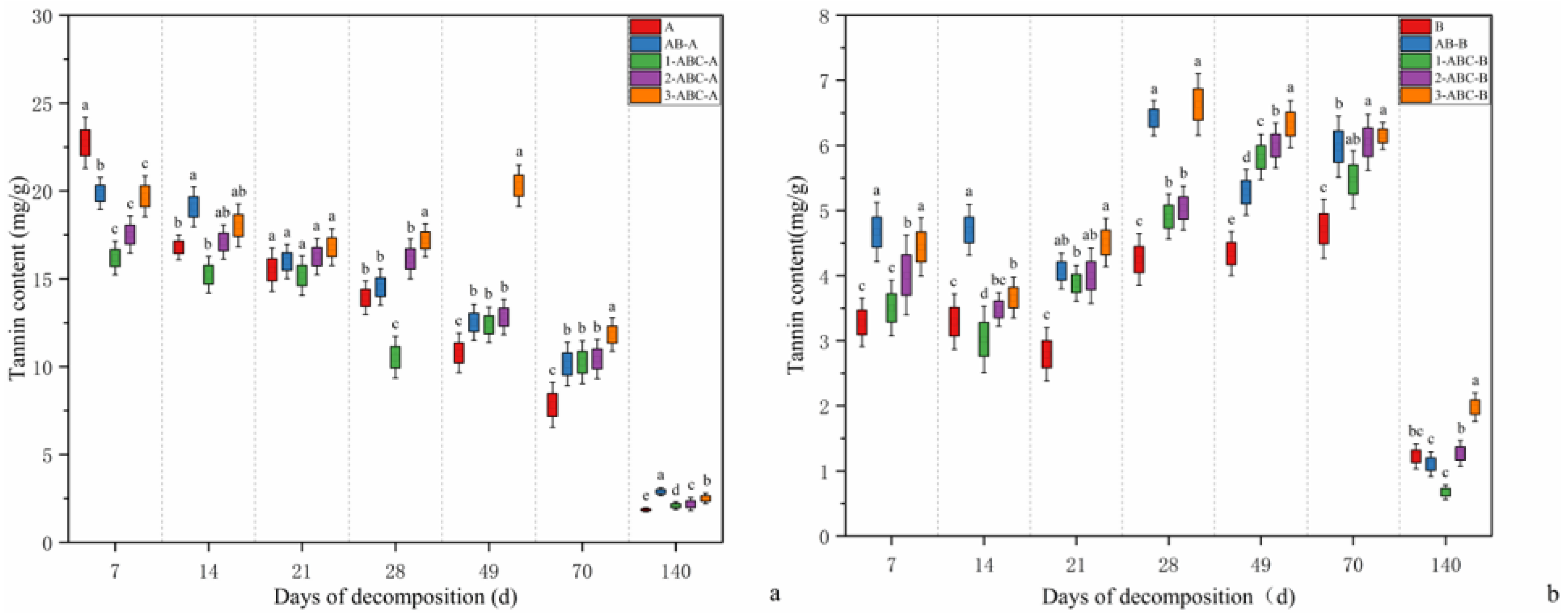 2.2. Changes in Tannin Content During Leaf Litter Decomposition