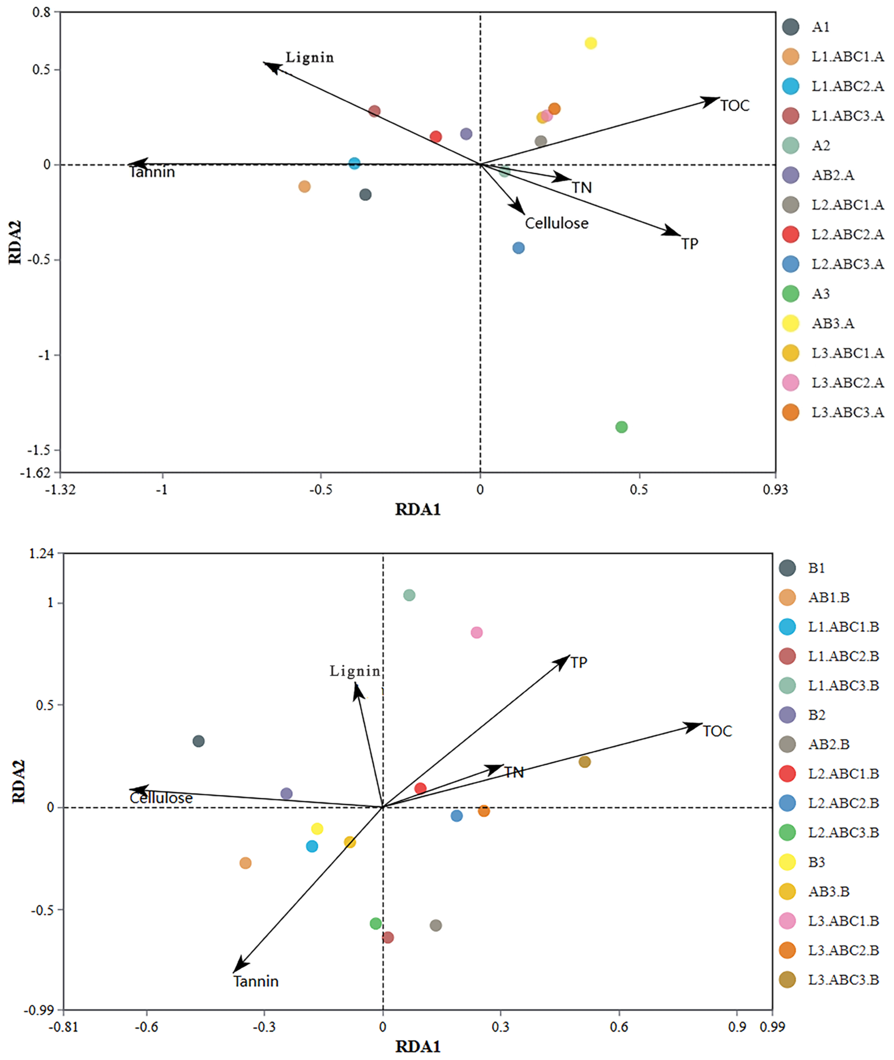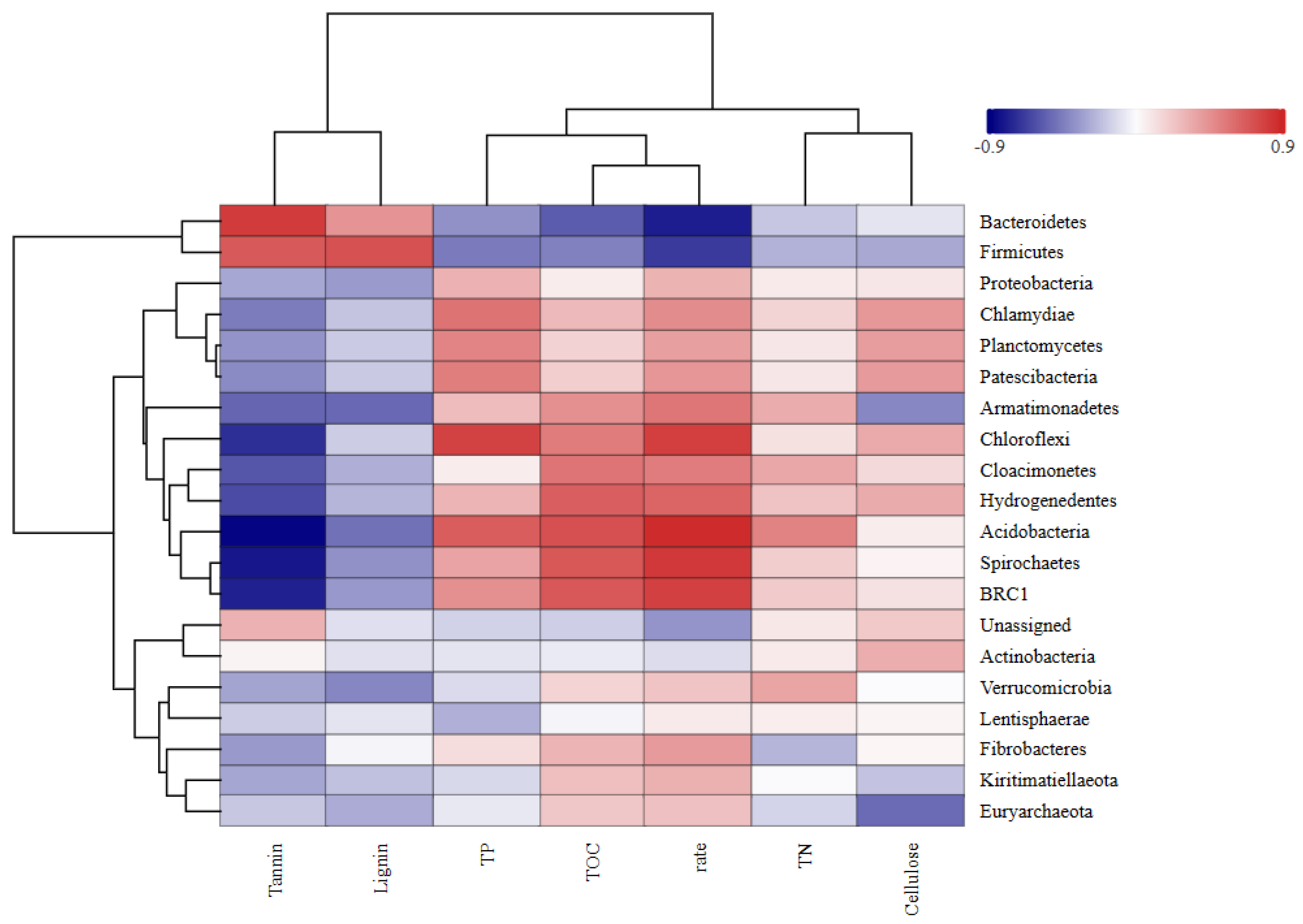 2.5.3. Correlations of Bacterial Community Structure with Leaf Litter Decomposition Rate and Tannin Content