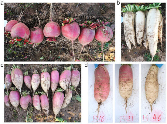 Taproot skin color of two inbred lines, SXAU-R2 and SXAU-W2, as well as their hybrid offspring. (a) Red-skinned parent SXAU-R2. (b) White-skinned parent SXAU-W2. (c) F1 generation. (d) Red-skinned, intermediate-color-skinned, and white-skinned individuals of the F2 segregant population.