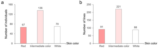Briefly, the parental polymorphic SSR markers were used to amplify the genomic DNA of the SXAU-R2 × SXAU-W2 F2 population. The genotypes, together with the phenotypic data of skin color, were imported into Joinmap software (version 4.0) to calculate the genetic distances between markers and the target gene by using the Kosambi function so as to complete the preliminary mapping of RST. For the next fine mapping, the heterozygous F2 individuals were selected by flanking markers of RST, and their seeds were planted to obtain the corresponding F2:3 plants. Markers in the initial RST section were continuously developed for amplifying the F2:3 plants to obtain new genetic exchange events. Combined with the skin color of F2:3 plants, the RST section was narrowed down.