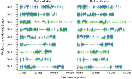 Using 20 red-skinned and 20 white-skinned individuals of the SXAU-R2 × SXAU-W2 F2 population, the red-skin bulk and white-skin bulk were constructed for BSA-seq, respectively. Each bulk obtained clean data above 20 Mb with Q30-based percentages greater than 93.93% and GC percentages ranging from 47.74 to 48.01% (Table S1), indicating that the sequencing data was of high quality for further analysis. The clean reads were then mapped on the radish reference genome (R. sativus var. radicula) and covered all the nine chromosomes of radish (Figure 3). Subsequently, the uni-transcripts were annotated as genes.