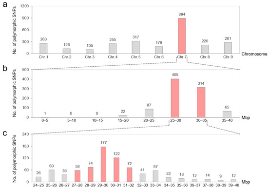 Chromosomal distribution of 2640 SNPs between annotated genes in the red skin bulk and white skin bulk. (a) Chromosomes 1~9 of radish. (b) Physical position of chromosomes 7. (c) The position of 28~32 Mbp on chromosome 7. The chromosome or physical position with high SNP distribution was marked in red.