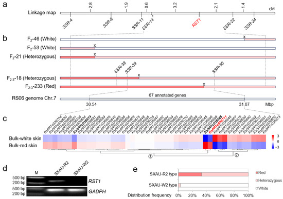 Fine mapping of RST1. (a) Linkage map of RST1 in the SXAU-R2 × SXAU-W2 F2 population. RST1 was marked in red. (b) Diagrams of the locations of crossovers in three recombinant F2 individuals and two F2:3 lines deriving from the F2-21 individual. The red box referred to the SXAU-R2 allele, the white box referred to the SXAU-W2 allele, pink box referred to the heterozygote, and the gray box referred to the targeted region of RST1. ‘X’ indicated a crossover event. (c) Heatmap of the expressed annotated genes within the RST1 region based on the BSA-seq data. Genes significantly up-expressed in the red-skinned bulk were highlighted in bold, and the candidate gene was marked in red. (d) Agarose gel electrophoresis results of the diagnostic marker developed for the causing gene Rs0R7c036711 of RST1. The radish GADPH gene was used as the positive control. The diagnostic marker of RST1 had an amplification product in red-skinned parent SXAU-R2, but not in white-skinned parent SXAU-W2. Marker of positive control GADPH had amplification products in both parents. M: DNA ladder marker. (e) Phenotype of taproot skin color of F2 individuals corresponding to the two alleles of RST1 that were detected by the diagnostic marker.