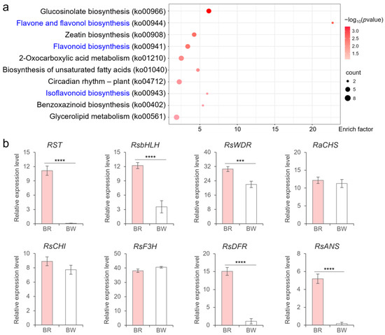 DEGs between red-skinned bulk and white-skinned bulk. (a) The top 10 terms of KEGG enrichment results for DEGs. Term names related to flavonoid biosynthesis were marked in blue. The dot color and the dot size indicated the significance of enrichment and the count of enriched genes in terms, respectively. (b) Relative expression level of RST1, RsbHLH, RsWDR, and genes involved in anthocyanin synthesis. CHS: chalcone synthase; CHI: chalcone isomerase; F3H: flavanone 3-hydroxylase; DFR: dihydroflavonol-4-reductase; ANS: anthocyanidin synthase. BR: red-skinned bulk; WR: white-skinned bulk. *** indicates p < 0.001, and **** indicates p < 0.0001.