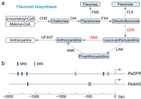 The flavonoid biosynthesis pathway. (a) Biochemical reaction steps of flavonoid synthesis. Chemical products were shown in boxes, and enzymes were shown next to the arrows. The enzymes marked in red indicated that its coding gene was highly expressed in the red-skinned bulk in this study. CHS: chalcone synthase; CHI: chalcone isomerase; FNS: flavone synthase; F3H: flavanone 3-hydroxylase; FLS: flavonol synthase; DFR: dihydroflavonol-4-reductase; ANS: anthocyanidin synthase; LAR: leucoanthocyanidin reductase; ANR: anthocyanidin reductase; UF3GT: flavonoid 3-O-glucosyltransferase. (b) Putative binding sites of the MBW complex in the promoter region of RsDFR (Rs0R9c041942) and RsANS (Rs0R4c020786). The blue and yellow small rectangles represented the MYB-recognizing element (MRE) and bHLH-recognizing element (BRE), respectively.