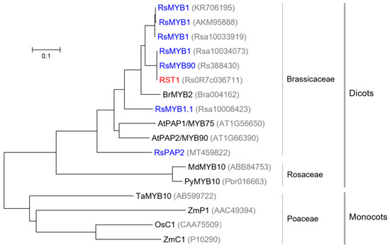 Phylogenetic analysis of flavonoid-related MYBs based on their amino acid sequences. The accession numbers of the MYBs were listed in brackets. MYBs in radish were marked in blue, and the MYB encoded by RST1 in this study was marked in red. In addition, AtPAP1/MYB75 and AtPAP2/MYB90 were from Arabidopsis thaliana, BrMYB2 from Chinese cabbage (Brassica rapa), MdMYB10 from apple (Malus domestica), PyMYB10 from pear (Pyrus), TaMYB10 from wheat (Triticum aestivum), ZmP1 and ZmC1 from maize (Zea mays), and OsC1 from rice (Oryza sativa). Bar meant 0.1 substitutions per site.
