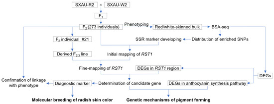 The red-skinned radish SXAU-R2 is an inbred line that originated from the landrace Dahongpao after five generations of self-fertilization, and SXAU-W2 is a white-skinned inbred line selected from the hybrid progeny of landraces Zhentoubai and Shibai, with the characteristics of heat tolerance, disease resistance, and great adaptability. The biparental populations of SXAU-R2 and SXAU-W2, including the F1 heterozygote, F2 plants with 273 individuals, and F2:3 families derived from certain F2 plants, were used to identify the red-skinned taproot gene carried by SXAU-R2. The above materials were collected and preserved by the Radish Germplasm Resources Innovation and Genetic Breeding Research Group of the College of Horticulture, Shanxi Agricultural University. The experiments conducted on these materials in this study are shown in Figure 9.