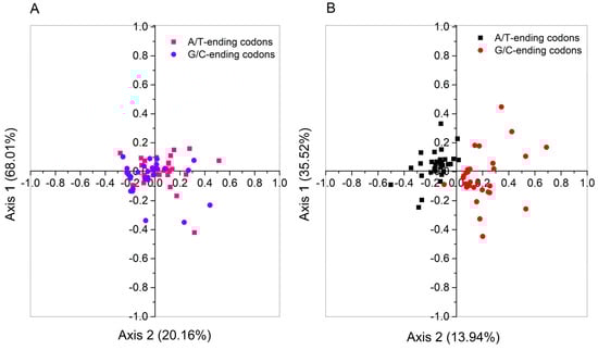 COA was conducted on codon usage patterns in CsPPO genes. The analysis was conducted using the RSCU values calculated from these genes. The results indicated that Axis 1 accounted for 68.01% of the total variation, whereas Axis 2 explained 20.16% of the overall variation (Figure 4A). AT-ending codons were predominantly localized near the central region of the plot, primarily within the positive quadrant, whereas GC-ending codons were mostly aggregated around the axis origin, with a few distributed toward the negative quadrant. To further examine codon usage divergence across species, an additional COA was performed using PPO genes from Camellia species and non-Camellia species. In this comparative analysis, Axis 1 and Axis 2 accounted for 35.52% and 13.94% of the total variation, respectively (Figure 4B). Codons were clearly separated along these axes based on their third nucleotide base: A/T-ending codons tended to cluster in specific regions distinct from those of G/C-ending codons. COA indicates that CUB in PPO genes results from a combination of mutational pressure, natural selection, and other potential contributing factors.