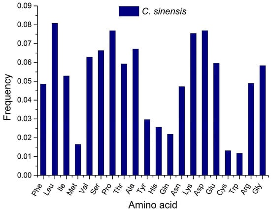 Amino acid composition acts as a vital indicator, revealing insights into an organism’s physiological functions, biological stability, and evolutionary trajectories [27]. Variations in genomic GC content have a direct effect on amino acid composition, subsequently affecting codon usage patterns [28]. In CsPPO genes, leucine, proline, aspartic acid, and lysine were the most abundant amino acids, whereas tryptophan, cysteine, and methionine were present at lower frequencies (Figure 5). Overall, hydrophobic and hydrophilic amino acids accounted for a substantial proportion of the complete amino acid profile in CsPPO genes. In addition to CsPPO genes, amino acid usage frequencies were also analyzed for PPO genes from other Camellia species and non-Camellia species (Table S5). The results showed that the most frequently used amino acids across all species were alanine, aspartic acid, leucine, proline, and lysine. In contrast, methionine, cysteine, and tryptophan were the least frequently used amino acids. These findings align with the patterns observed in CsPPO genes, in which hydrophobic and hydrophilic amino acids collectively constitute a major proportion of the overall amino acid composition.