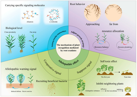Recent studies demonstrate that root exudation patterns exhibit marked spatiotemporal heterogeneity, regulated by three primary factors including host plant genetic factors, soil physicochemical properties, and rhizosphere microbial interactions. To elucidate the mechanisms of root secretion-mediated recognition, this review integrates current knowledge across four key aspects: (1) root exudate composition, (2) environmental and biological regulation of exudation dynamics, (3) plant–plant recognition systems, and (4) molecular mechanisms of secretion-mediated identification. This comprehensive analysis establishes a conceptual framework for understanding the complex rhizosphere communication network.
