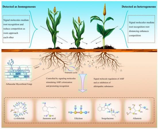 Crop kin recognition constitutes an evolutionary adaptation that optimizes resource distribution and improves population fitness, with Oryza sativa serving as a principal model. This species utilizes root exudates as chemical cues for kin discrimination, effectively suppressing weeds while reducing allelopathic expenditure, thus enhancing growth compatibility among relatives [110]. While root exudates are confirmed mediators of kin recognition, their mechanistic basis requires further investigation [111]. Research indicates three potential recognition compound classes: secondary metabolites (e.g., rice allantoin) [112,113], phytohormones (e.g., strigolactones, jasmonates) [114,115], and specialized signals (e.g., ryegrass lactone) [116]. These chemical mediators facilitate complex resource allocation decisions during competitive interactions. Future studies should focus on CMN–root exudate crosstalk to decipher integrated underground communication systems.