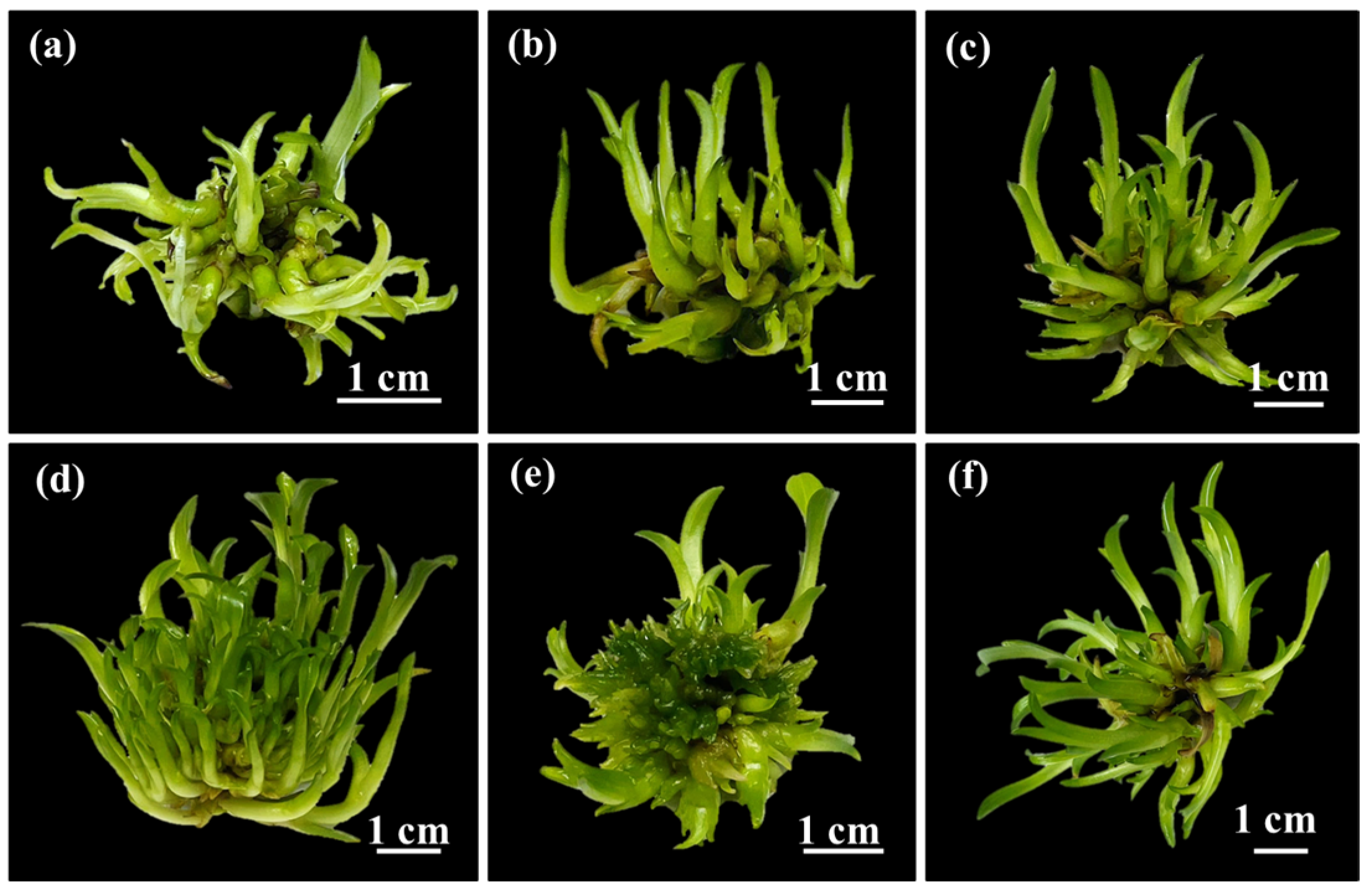 - Ekmekçigil, M.; Bayraktar, M.; Akkuş, Ö.; Gürel, A. High-frequency protocorm-like bodies and shoot regeneration through a combination of thin cell layer and RITA® temporary immersion bioreactor in Cattleya forbesii Lindl. Plant Cell Tissue Organ Cult. (PCTOC) 2019, 136, 451–464. [Google Scholar] [CrossRef]
