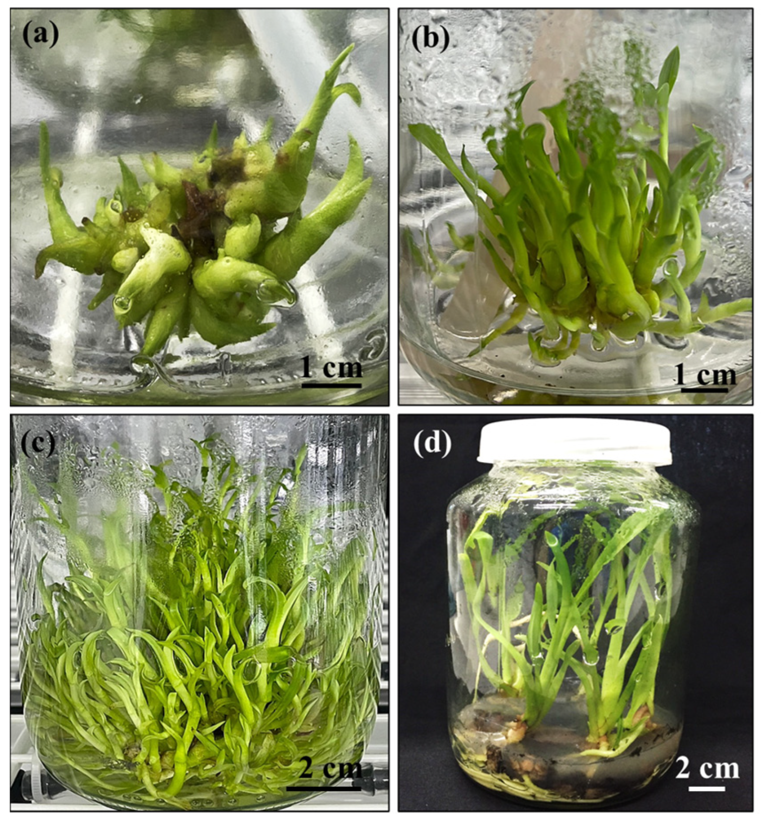 - Zhang, B.; Niu, Z.; Zhou, A.; Zhang, D.; Xue, Q.; Liu, W.; Chen, J.; Shen, J.; Ding, X. Micropropagation of Dendrobium nobile Lindl. plantlets by temporary immersion bioreactor. J. Biobased Mater. Bioenergy 2019, 13, 395–400. [Google Scholar] [CrossRef]