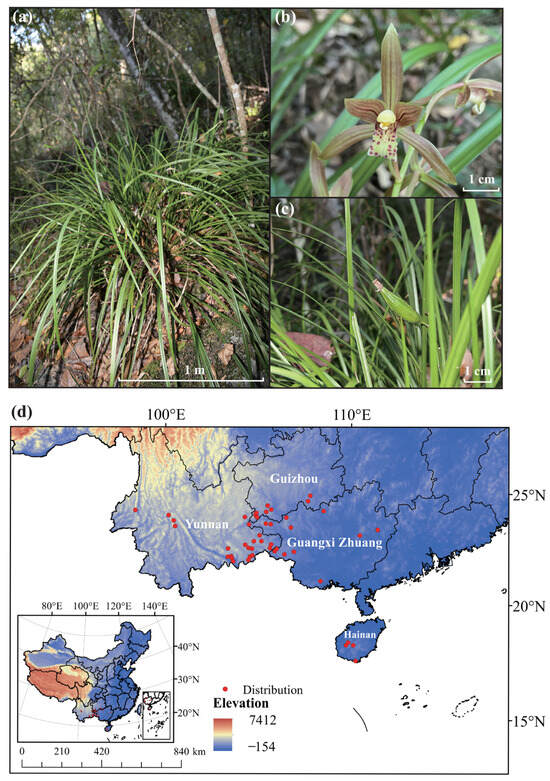 The Orchidaceae family is known for its vast species diversity [9]. It is also one of the most visually appealing plant families, ranking as the second largest among angiosperms worldwide [10,11]. Within this family, the semi-epiphytic Cymbidium cyperifolium exhibits distinctive morphological and ecological characteristics (Figure 1a–c), and is primarily distributed in southern China, including Guangdong, Hainan, southern Guangxi, southwestern Guizhou, and southeastern Yunnan (Figure 1d). Beyond China, its range extends to Nepal, Bhutan, India, Myanmar, Thailand, Vietnam, Cambodia, and the Philippines. This perennial herb demonstrates a prolonged flowering period extending from October to February of the subsequent year. Its floral morphology produces lemon-scented flowers akin to those of C. kanran. The phyllotaxis of C. cyperifolium is particularly noteworthy, typically presenting 4–12 distichously arranged leaves that form a characteristic fan-shaped architecture, a unique trait distinguishing it from other congeneric species. Ecological investigations reveal its preference for well-drained lithophytic environments in subtropical evergreen broad-leaved forests, predominantly karst landforms at elevations between 900 and 1600 m. The Yachang Orchidaceae National Nature Reserve harbors the world’s largest known population of C. cyperifolium, with both population density and total abundance surpassing those of other documented localities. Population densities can reach 8.2 ± 1.3 individuals/m2 in optimal microhabitats, the highest documented for this species [12]. Nevertheless, there is a significant lack of documented information and scientific studies regarding the population status of C. cyperifolium due to habitat loss and wild collection.
