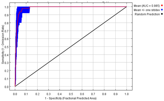 The Area Under the Curve (AUC) value was chosen as the metric for assessing the accuracy of the model prediction in this study. The Maxent model software can generate the Receiver Operating Characteristic (ROC) curve corresponding to its prediction results and calculate its AUC value.