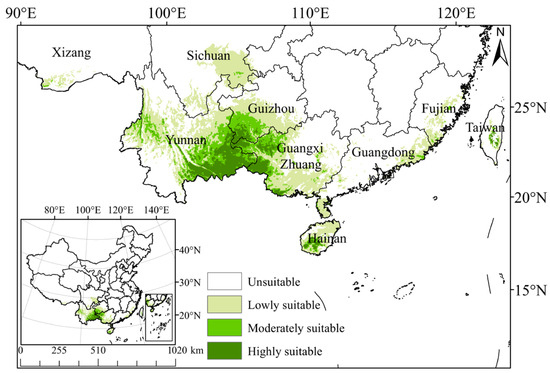 The Maxent model predicts that the total suitable growth area of C. cyperifolium spans 52.37 × 104 km2, comprising 5.45% of the entire study area (Table 2). Areas of high suitability are predominantly located in the southeastern Yunnan Province, southwestern Guizhou Province, the western Guangxi Zhuang Autonomous Region, and southwestern Hainan Province, covering 7.67 × 104 km2 and accounting for 0.80% of the entire research area. Moderate suitability regions are primarily situated in the southwest subtropical regions in China, including Yunnan, Guangxi Zhuang Autonomous Region, Guizhou, Hainan, etc. In contrast to the highly suitable areas, the moderately suitable area also extends into the eastern Guangdong Province and central Fujian Province, covering 10.12 × 104 km2 or 1.05% of the total study area. The poorly suitable area encompasses the majority of Yunnan Province, eastern and southern Guangxi Province, eastern Guizhou Province, southeastern Sichuan Province, and some parts of Guangdong Province and Fujian Province in Taiwan Province, with an area of 34.58 × 104 km2, representing 3.60% of the entire study area (Figure 3).