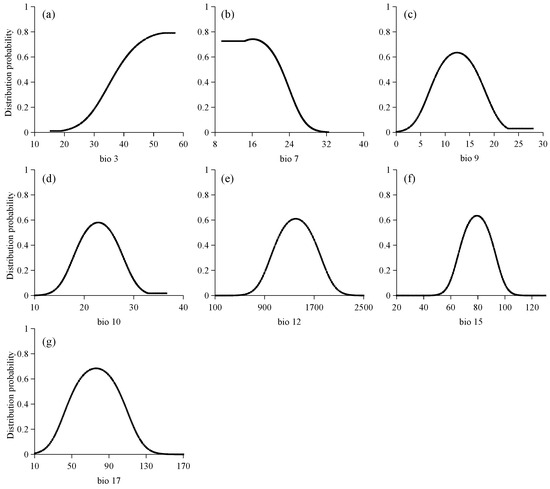 Response curve for 7 climate variables: (a) isothermality, (b) temperature annual range, (c) mean temperature of driest quarter, (d) mean temperature of warmest quarter, (e) annual precipitation, (f) precipitation seasonality, (g) precipitation of driest quarter.
