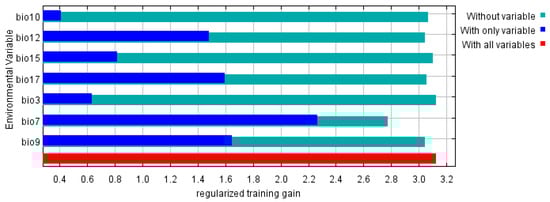 The Jackknife test results for each climate variable indicate that when simulations are conducted using a single variable, the three variables that contribute the most to the model’s regularization training gains are the temperature annual range (Bio 7), the mean temperature of driest quarter (Bio 9), and the precipitation of driest quarter (Bio 17) (Figure 5). These climate variables provide more comprehensive and effective information than others. The temperature annual range (Bio 7), with contributions of 77.42%, contributes significantly to the model’s performance. This suggests that both the direct and indirect impacts on the distribution range of C. cyperifolium as critical limiting or promoting factors.