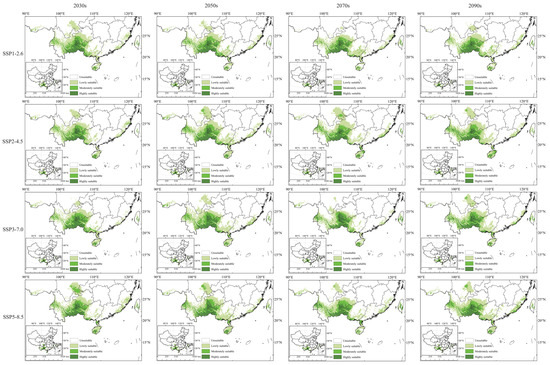 Figure 6 indicates that the geographic distribution of potential suitable areas for C. cyperifolium under the four future climate scenarios remains largely consistent with the current scenario. These continue to be concentrated in the subtropical climate regions of China, with highly suitable areas mainly located in the southeastern Yunnan Province, the southwestern Guizhou Province, the western Guangxi Zhuang Autonomous Prefecture, the southwestern of Hainan Province, and the central Taiwan Province. Significant changes in area primarily occur in the southern region of Sichuan. The optimal area during the 2070s SSP1–2.6 and SSP3–7.0 periods is relatively small, whereas SSP2–4.5 and SSP5–8.5 scenarios display larger areas.