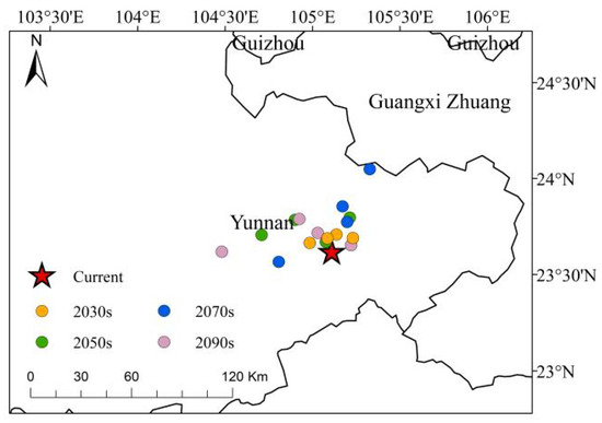 In most instances, the centroid migrates westward and northward (Figure 8). The temperature increase in high-altitude regions is more pronounced compared to lower altitudes, significantly altering species’ geographical distributions [44], encouraging species to move northward or migrate to higher altitudes [45,46]. Due to the combined influence of the Qinghai–Tibet Plateau, the East Asian monsoon, and Southwest monsoon, climate change in the karst region of central Yunnan, situated on a low-latitude plateau, is particularly pronounced and complex, making it sensitive to climate change [47]. Cheng et al. [48] noted that climate zones in Yunnan are shifting, with an increase in subtropical areas and a decrease in northern subtropical and temperate regions, demonstrating a northward movement and a trend of expansion into high-altitude areas.