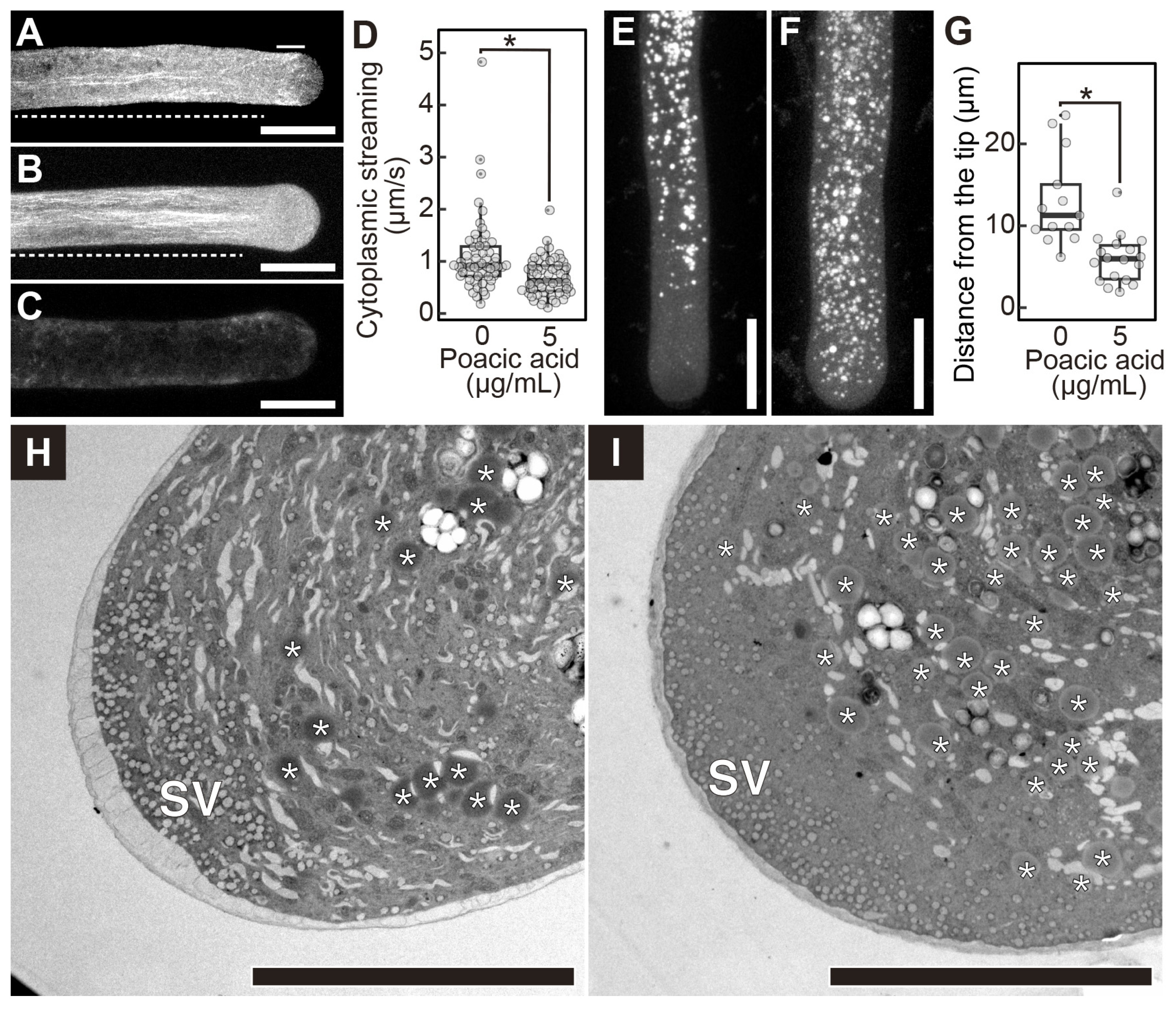 2.3. Poacic Acid Inhibits Endocytosis and Secretion and Disrupts Actin Filaments in Pollen Tubes
