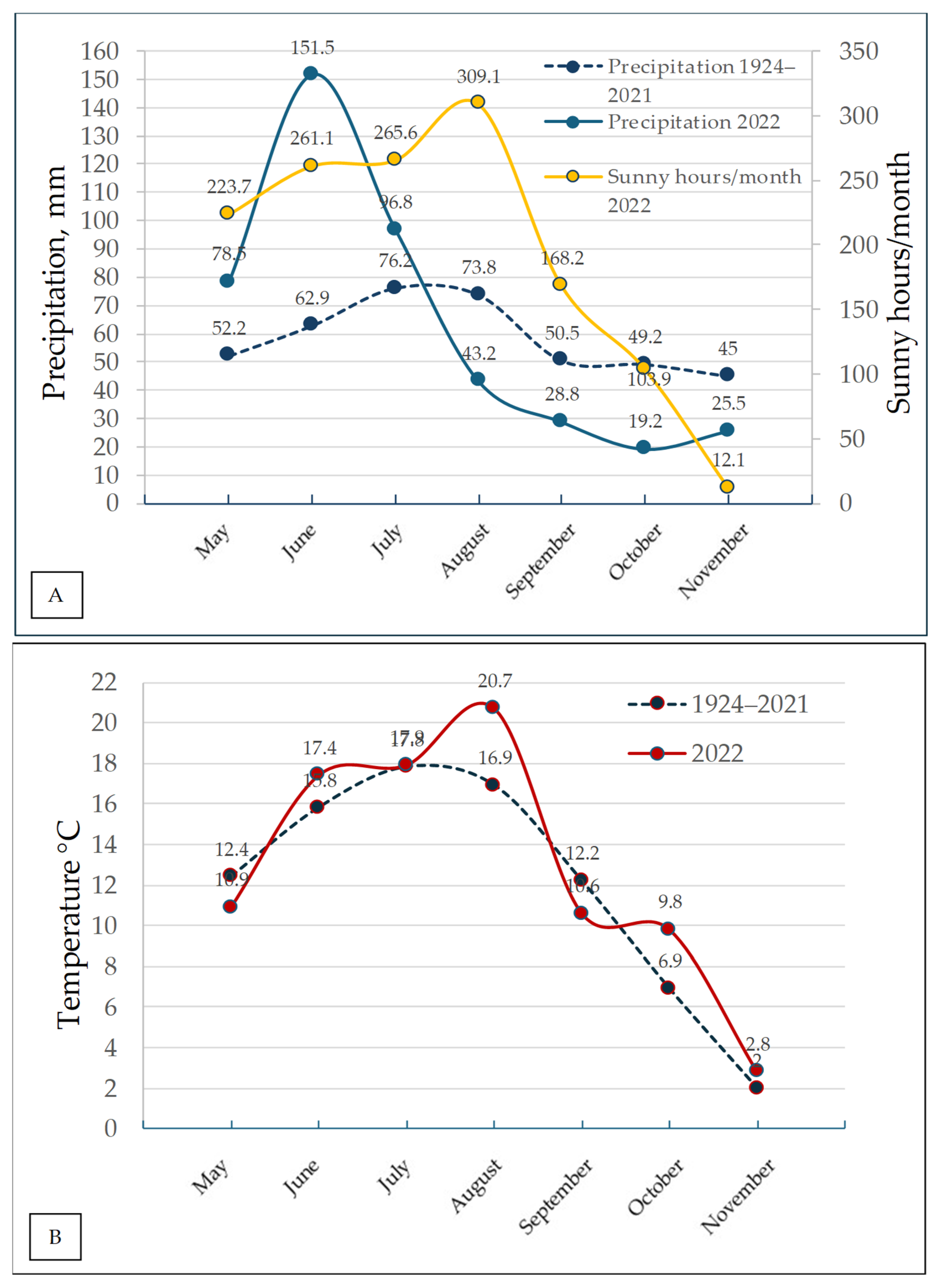 Figure 3. (A) Precipitation in 2022 compared with the 1924–2021 average and monthly sunshine hours in 2022; (B) temperature during the soybean cultivation period in 2022 compared with the long-term average (1924–2021) in Akademija.