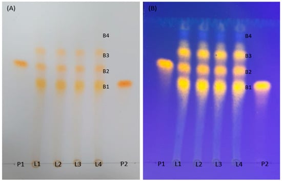 Thin-layer chromatography of the four batches (L1–L4) of Psidium guajava L. aqueous extracts (EAPG, 4.0 mg/mL) and the standards guaijaverin (P1) and hyperoside (P2) (1 mg/mL). Eluent: ethyl acetate-methyl alcohol-water-formic acid (20:2.7:2:0.2). (A) Chromatoplate (ALUGRAM® SIL G Macherey-Nagel, Düren, Germany) revealed with NP-PEG; (B) Chromatoplate visualized under ultraviolet light (λ = 365 nm). B1–B4: Bands 1 to 4.