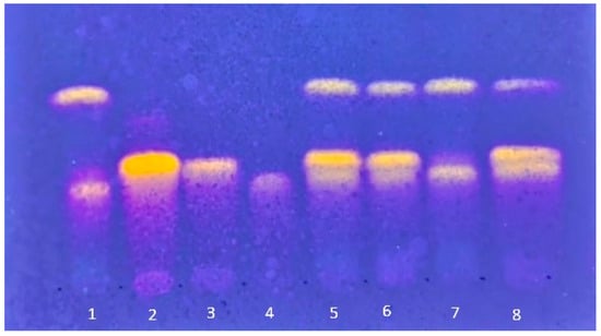 Thin-layer chromatography of batch L3 of Psidium guajava L. aqueous extracts (EAPG) and standards. Eluent: acetonitrile: formic acid (1%) (40:60). Chromatoplate (TLC Silica gel 60 RP-18 F254 Supelco, Bellefonte, PA, USA) revealed with NP-PEG and visualized under ultraviolet light (λ = 365 nm). 1: EAPG; 2: hyperoside; 3: isoquercitrin; 4: guaijaverin; 5: EAPG-hyperoside co-elution; 6: EAPG-isoquercitrin co-elution; 7: EAPG-guaijaverin co-elution; 8: EAPG-hyperoside-isoquercitrin-guaijaverin co-elution.
