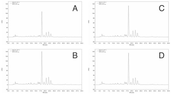 Chromatogram obtained by HPLC-DAD of Psidium guajava L. aqueous extracts (EAPG, 5 mg/mL). Analysis conditions: PurospherStar RP C18e (Merck, Darmstadt, Germany) column maintained at 25 °C; eluent: solvent A (1% phosphoric acid), solvent B (acetonitrile); detector: DAD; elution system: gradient; flow rate 0.6 mL/min; (A) EAPG batch 1; (B) EAPG batch 2; (C) EAPG batch 3; (D) EAPG batch 4.