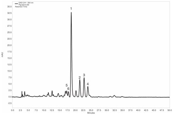 Representative HPLC chromatograms of Psidium guajava L. aqueous extracts (EAPG, 5 mg/mL). Chromatographic conditions: C18 column PurospherStar RP C18e column (150 × 4.6 mm, 5 mm, (Merck, Darmstadt, Germany). The detector was set to collect data at 354 nm. The mobile phase consisted of a 1% phosphoric acid and acetonitrile gradient at a flow rate of 0.6 mL/min, starting at 85% (1% phosphoric acid), decreasing to 75% until t = 45 min, and then returning to 85% until t = 50 min. The sample injection was 10 µL. All solvents used as mobile phase were filtered through a 0.22 μm, 47 mm polyvinylidene fluoride (PVDF) membrane (Merck, Darmstadt, Germany,).
