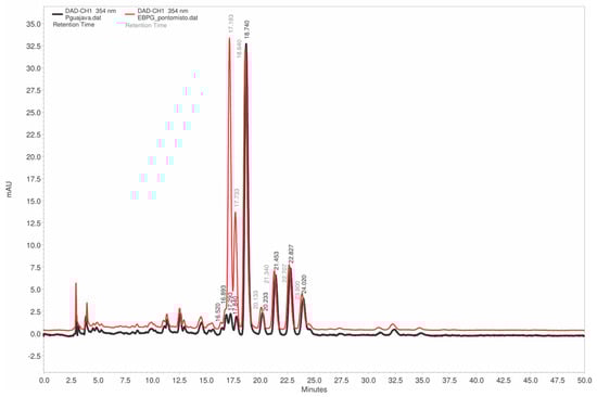 Overlay of representative HPLC chromatograms of Psidium guajava L. aqueous extracts (EAPG, black line) and Psidium guajava L. aqueous extracts enriched with isoquercitrin, hyperoside, and guaijaverin standards (red line). Chromatographic conditions: C18 column PurospherStar RP C18e column (150 × 4.6 mm, 5 mm, Merck, Darmstadt, Germany). The detector was set to collect data at 354 nm. The mobile phase consisted of a 1% phosphoric acid and acetonitrile gradient at a flow rate of 0.6 mL/min, starting at 85% (1% phosphoric acid), decreasing to 75% until t = 45 min, and then returning to 85% until t = 50 min. The sample injection was 10 µL. All solvents used as mobile phase were filtered through a 0.22 μm, 47 mm polyvinylidene fluoride (PVDF) membrane (Merck, Darmstadt, Germany).