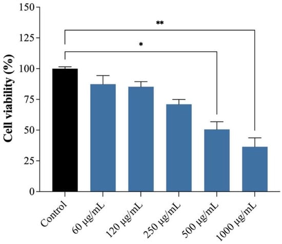 Effect of Psidium guajava L. aqueous extract (EAPG) on cell viability of gingival fibroblast (hGF) cells under EAPG treatment. The MTT assay was performed to measure the viability of hGF after 48 h of treatment with increasing concentrations of EAPG. The control group is represented by untreated cells. Results are presented as mean ± SD. The statistical analysis (Kruskal–Wallis) compares the treatment with the control (* p < 0.05; ** p < 0.05).
