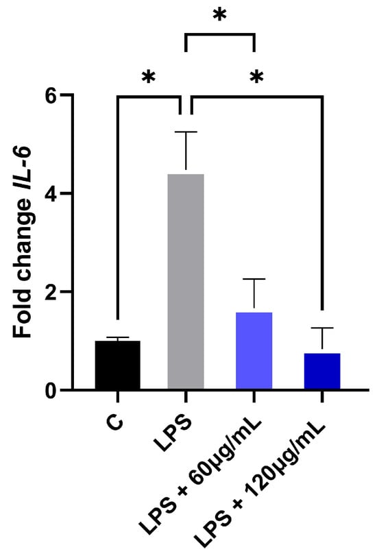 To assess the anti-inflammatory potential of EAPG, an LPS-induced inflammation model was used in hGF cells. Cells were plated at 6 × 104 cells/well in 12-well plates and stimulated with 1 μg/mL of LPS (lipopolysaccharide of Escherichia coli 0111: B4, Sigma-Aldrich, St. Louis, MO, USA) to induce an inflammatory environment. Immediately after LPS challenge, cells were treated with either 0.06 or 0.12 mg/mL of EAPG for 48 h, with untreated hGF serving as control. Following treatment, total RNA was extracted using TRI Reagent (Sigma-Aldrich, St. Louis, MO, USA) according to the manufacturer’s protocols. After RNA extraction, its concentration and purity were assessed, and 1 μg of total RNA was reverse-transcribed into cDNA using the High-Capacity cDNA reverse transcription kit (Thermo Fisher, Waltham, MA, USA).