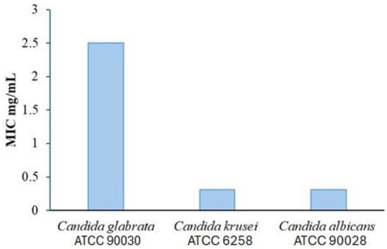 The EAPG exhibited antifungal activity against clinically relevant Candida species, with minimal inhibitory concentration (MIC) values ranging from 0.312 to 2.5 mg/mL (Figure 8). Notably, Candida albicans, the most prevalent fungal pathogen in oral infections, exhibited the highest sensitivity to the extract. These results complement existing research supporting the therapeutic application of P. guajava leaf preparations against oral pathogens, including microorganisms associated with gingivitis, and contribute to other studies that have demonstrated the applications of this species against agents that cause gingivitis [41].