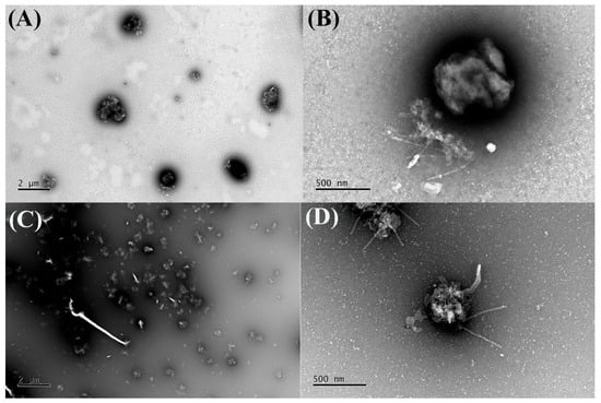 Morphological analysis, as observed by TEM, confirmed the presence of predominantly spherical chitosan nanoparticles with diameters exceeding 500 nm (Figure 9), exhibiting a monodisperse size distribution. The size and shape of the chitosan nanoparticles were not modified with the presence (Figure 9C,D) or absence (Figure 9A,B) of the EAPG.