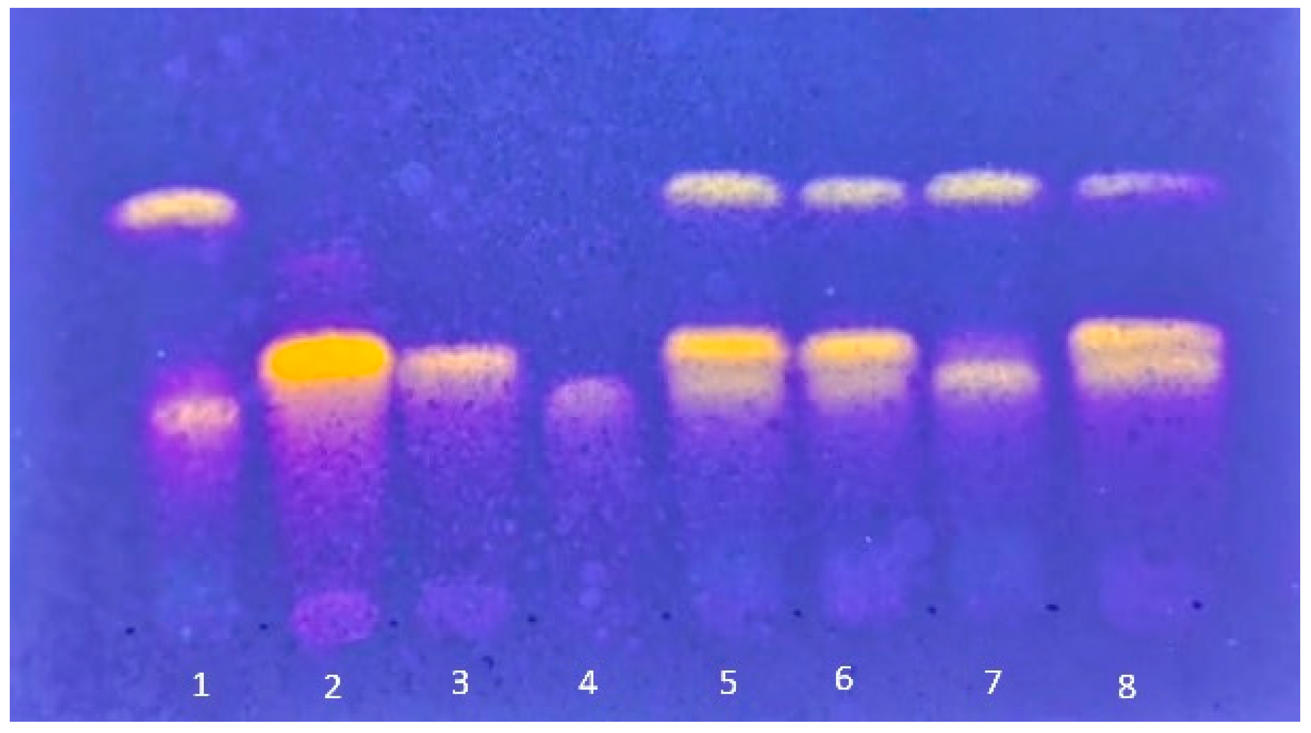 v). After development, plates were derivatized with NP-PEG reagent (1% diphenylborioxethylamine + 5% polyethylene glycol 400), purchased from Sigma-Aldrich, São Paulo, Brazil, and visualized under ultraviolet (UV) light (λ = 365 nm) in a UV chamber (Prodicil, Pinhais, Brazil) for enhanced detection of phenolic compounds. For compound identification, samples were compared against reference standards (1 mg/mL each). Retention factors (Rf) were calculated for all resolved bands, allowing for a comparative analysis of the migration patterns between the extract and authentic standards. The TLC profiles obtained for each sample were compared with those of the others.